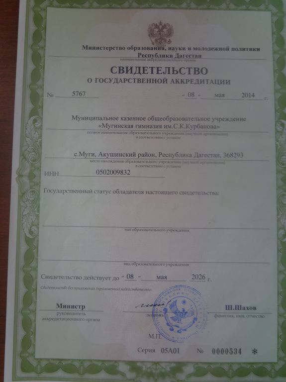 | Сокращенное наименование образовательной организации* | МКОУ "МУГИНСКАЯ ГИМНАЗИЯ ИМЕНИ С.К.КУРБАНОВА" |